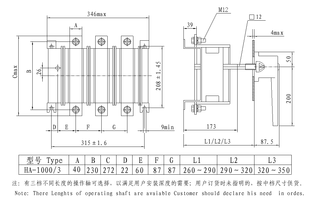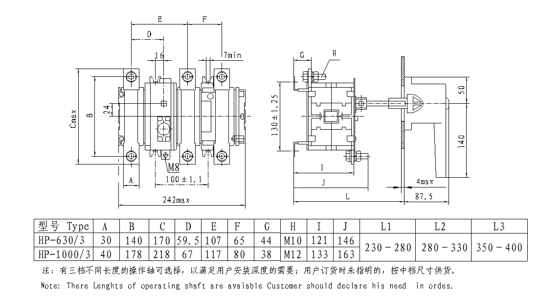 本系列隔離開關(guān)由刀型靜觸頭、滾動動觸頭及滅弧裝置組成的接觸系統(tǒng) 均組裝在由耐弧工程塑料制成的封閉底座內(nèi),能達到零飛弧。操作機構(gòu)由具有 彈簧儲能的連桿傳動機構(gòu)構(gòu)成,靠彈簧力完成開關(guān)的分、合,使開關(guān)動作無關(guān) 人力操作。手柄由操作手柄和傳動軸等構(gòu)成,屬旋轉(zhuǎn)操作方式。當(dāng)手柄旋轉(zhuǎn)操 作時,使操作機構(gòu)彈簧儲能,靠儲能的彈簧力釋放帶動動觸頭與靜觸頭形成 合、分兩種狀態(tài),從而達到開關(guān)分、合主電路的目的。
